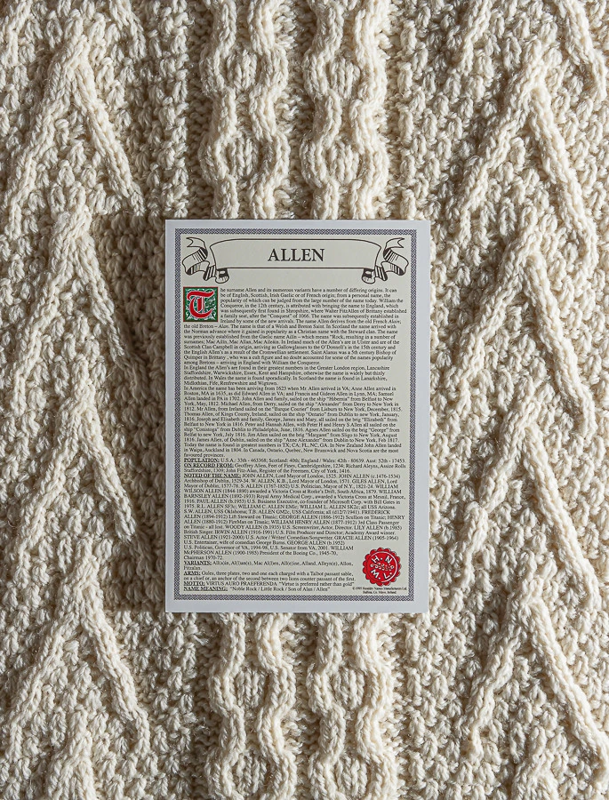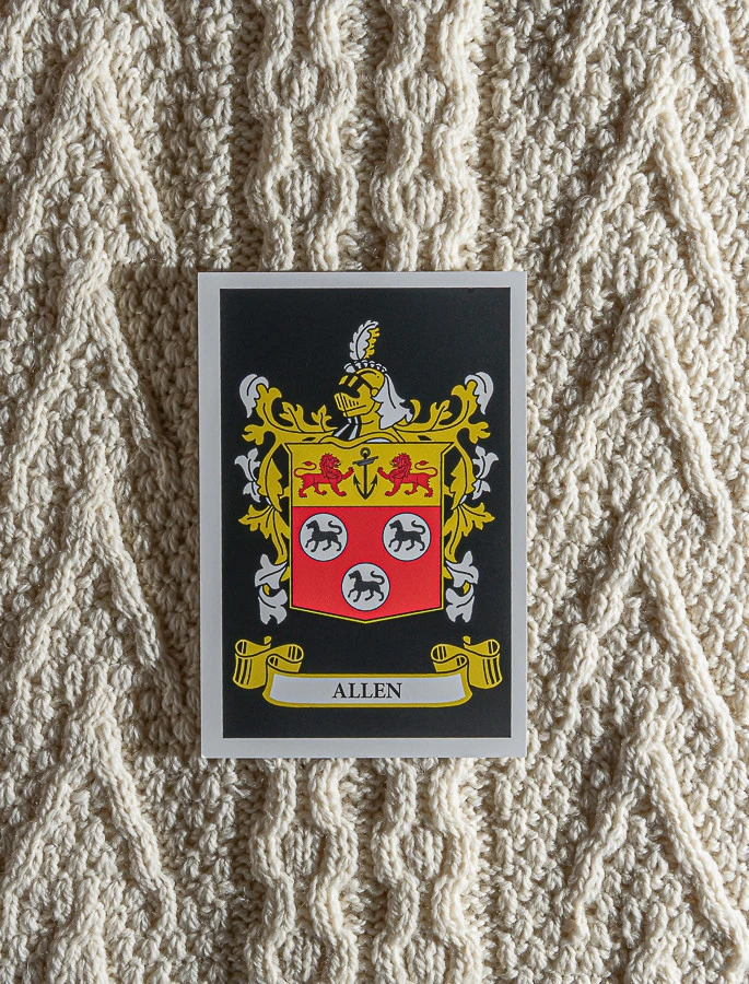 The Allen Clan Aran Scarf is a wonderful item of Allen heritage which will be cherished by the wearer for generations to come. Lovingly crafted from the finest 100% soft new wool, this Aran wool scarf has been created following the unique Allen Clan Aran pattern.