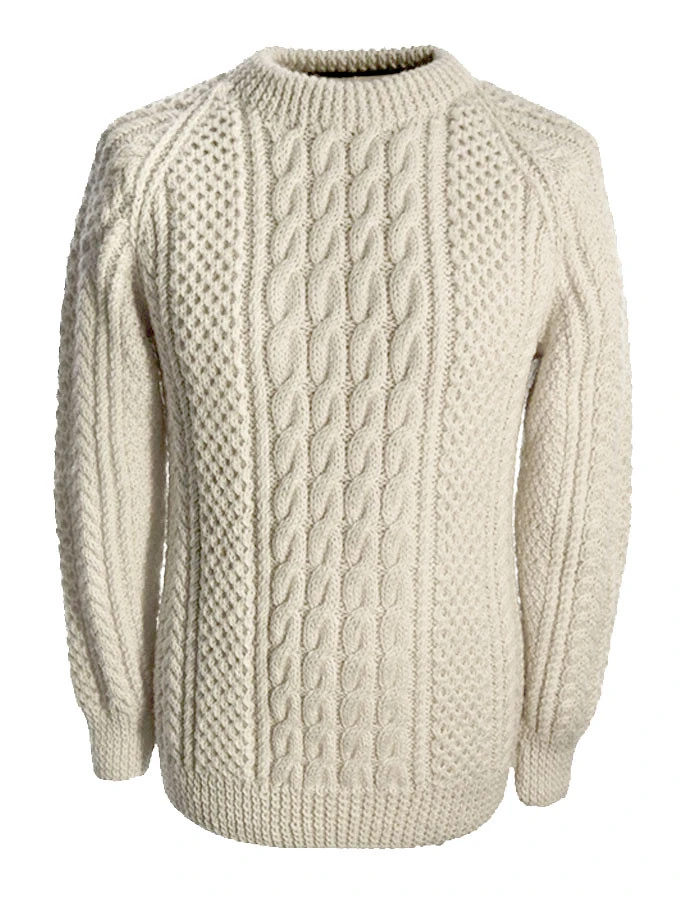 The hand knit Barry sweater has a cable centre panel, flanked by honeycomb, lobster claw and blackberry stitches on either side. The cable is symbolic of good luck, honeycomb represents work, lobster claw is a wish for prosperity and blackberry is symbolic of the Holy Trinity. This beautiful Aran sweater has been hand knitted in the traditional bĂĄinĂn (pronounced âbaw neenâ) colour, the natural white of the wool. It comes to you complete with a clan history and crest. It is made of 100% pure new wool, is water repellent and breathable. It has been hand crafted in the traditional Irish style, and, with care, will last a lifetime.