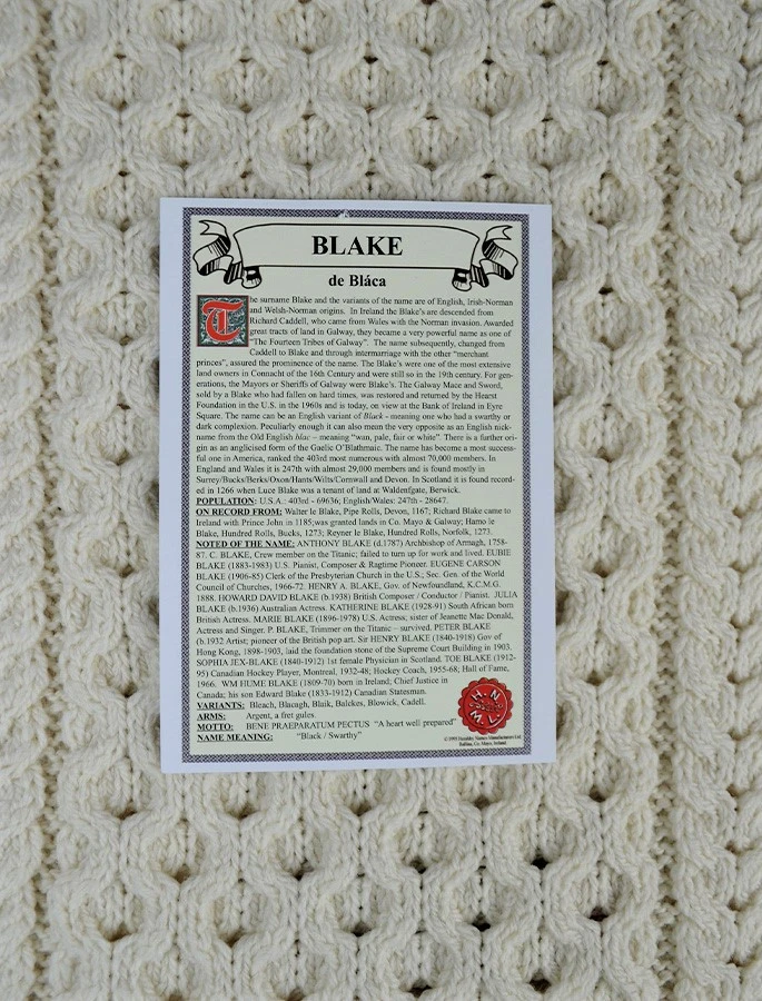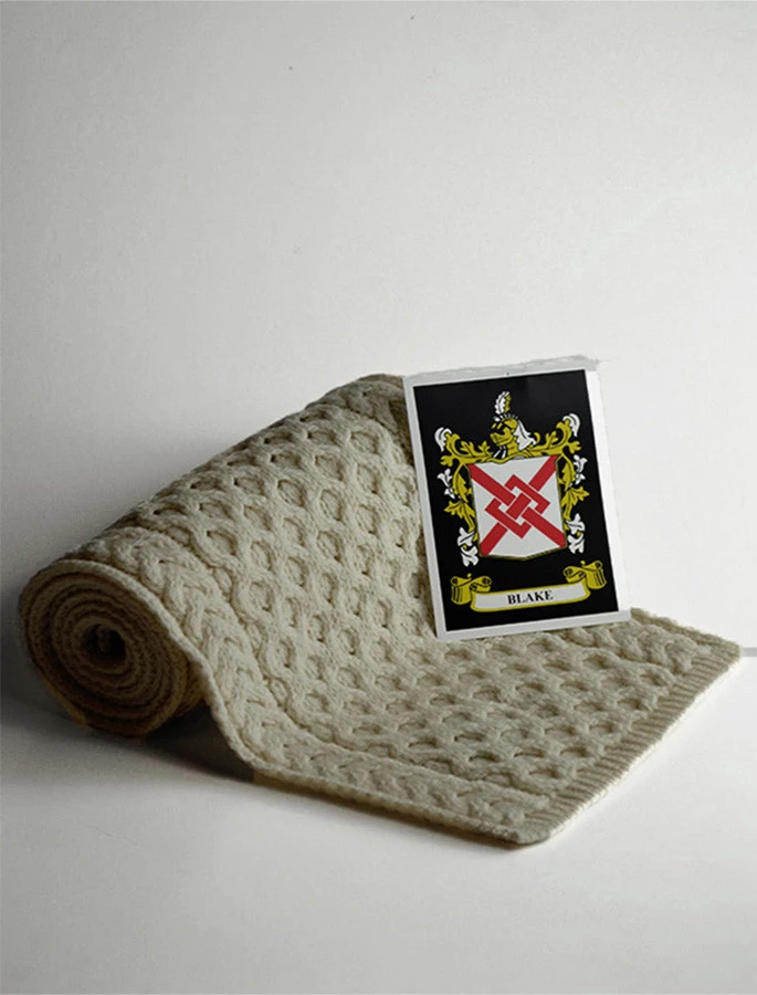 The Blake Clan Aran Scarf is a wonderful item of Blake heritage which will be cherished by the wearer for generations to come. Lovingly crafted from the finest 100% soft new wool, this Aran wool scarf has been created following the unique Blake Clan Aran pattern.Β