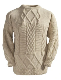 The hand knit Boyle sweater has an unusual trellis centre panel, flanked by cable, honeycomb rope, zig-zag and moss on either side. The trellis represents the stone walled fields of the Aran Islands, cable represents good luck, honeycomb symbolises work, the zig zag stitch has come to represent the ups and downs of marriage and moss is symbolic of nature. This beautiful Aran sweater has been hand knitted in the traditional báinín (pronounced ‘baw neen’) colour, the natural white of the wool. It comes to you complete with a clan history and crest. It is made of 100% pure new wool, is water repellent and breathable. It has been hand crafted in the traditional Irish style, and, with care, will last a lifetime.