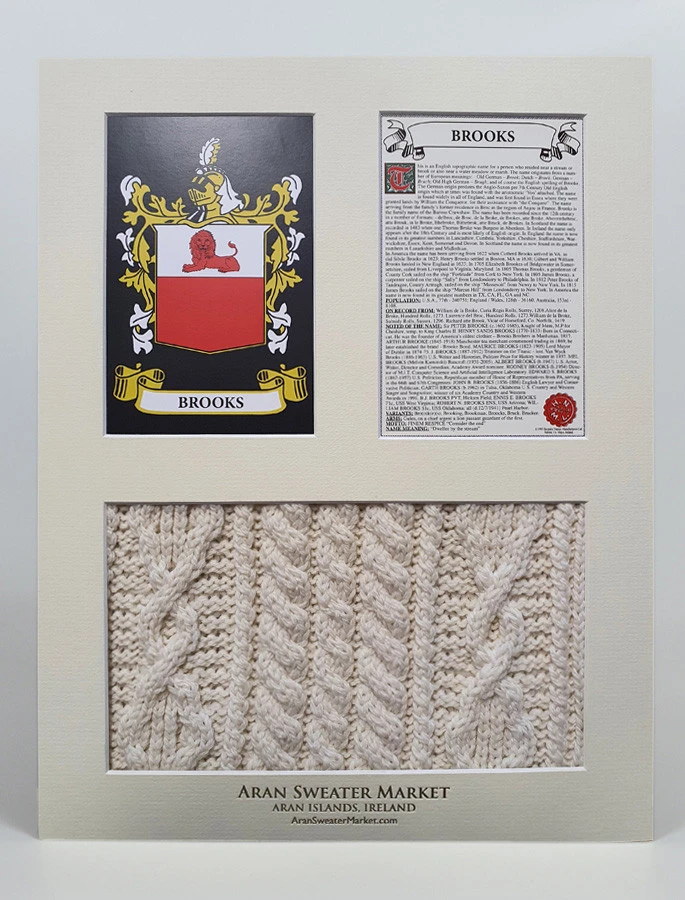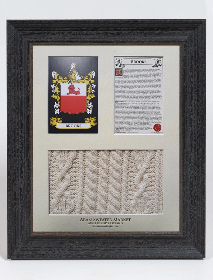 The Brooks Clan Aran & History Display is a wonderful item of Brooks heritage which can be proudly displayed in your home or place of work to demonstrate the pride your have in your Brooks name.