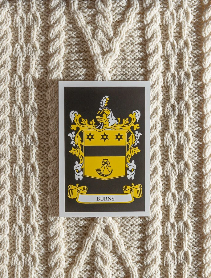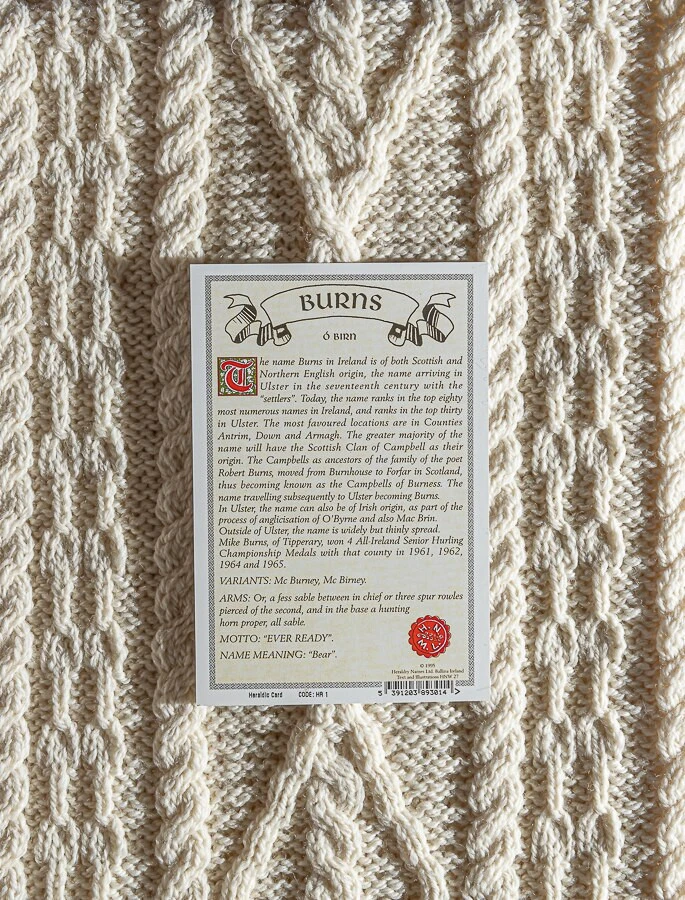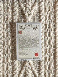 The Burns Clan Aran Scarf is a wonderful item of Burns heritage which will be cherished by the wearer for generations to come. Lovingly crafted from the finest 100% soft new wool, this Aran wool scarf has been created following the unique Burns Clan Aran pattern.