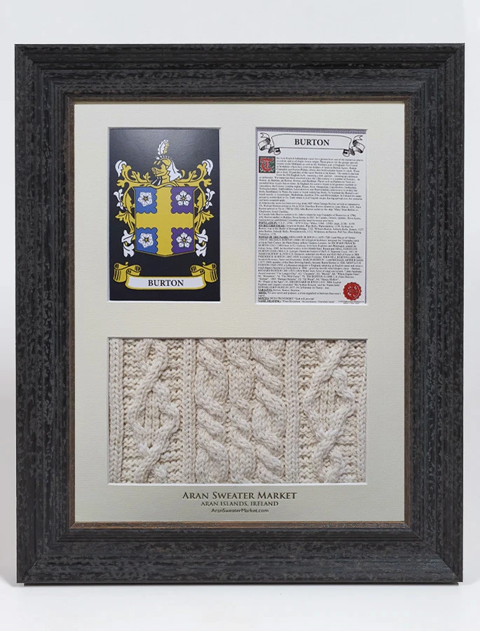 - Display also includes decorative color print of the Burton Clan crest placed alongside a clan history featuring information on the Burton family name, it’s ancient origins and even includes variants and deviations of the name.