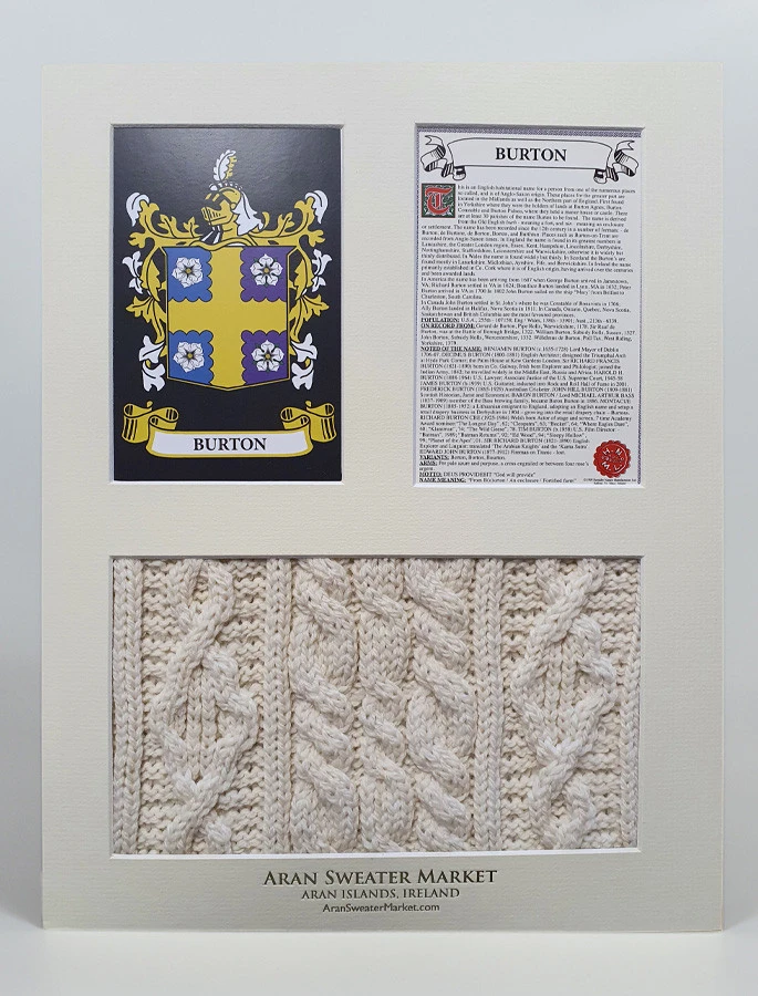 The Burton Clan Aran & History Display is a wonderful item of Burton heritage which can be proudly displayed in your home or place of work to demonstrate the pride your have in your Burton name.
