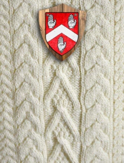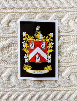 This beautiful Byrne Clan Aran Throw (measuring 64″ by 40″) has been produced in the traditional báinín (pronounced ‘baw neen’) colour, the natural white of the wool. It comes to you complete with a clan history and crest.