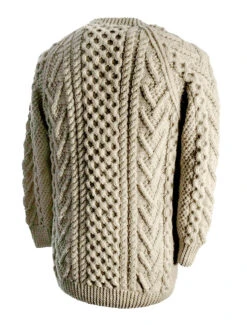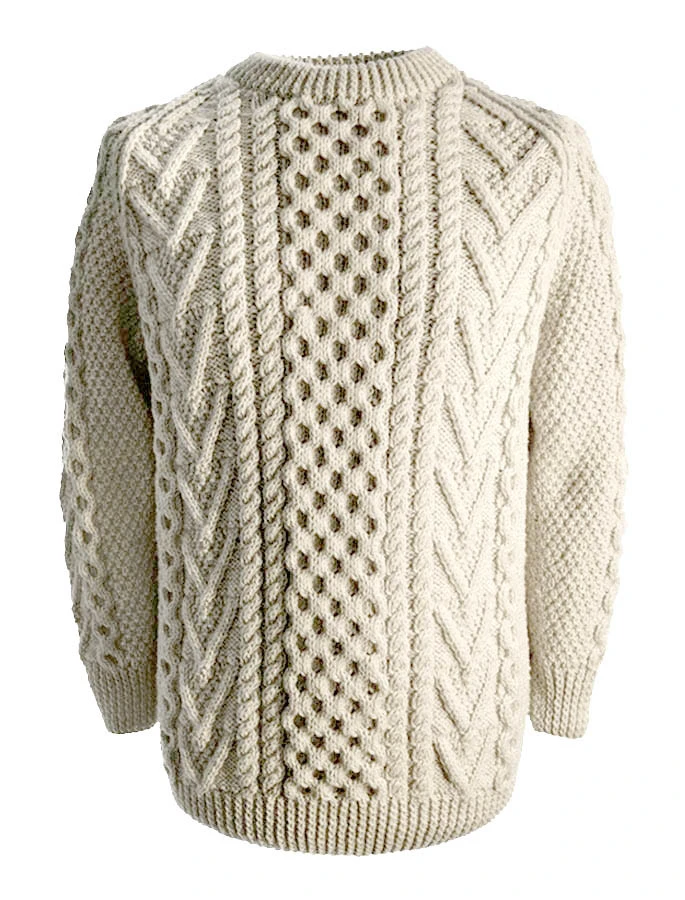 The hand knit Cahill sweater has a honeycomb central panel, flanked by double rope stitch, moss, chevron and honeycomb rope on either side. The honeycomb stitch symbolises work, moss stitch represents nature, and rope stitch is a form of cable, which represents good luck. This beautiful Aran sweater has been hand knitted in the traditional bĂĄinĂn (pronounced âbaw neenâ) colour, the natural white of the wool. It comes to you complete with a clan history and crest. It is made of 100% pure new wool, is water repellent and breathable. It has been hand crafted in the traditional Irish style, and, with care, will last a lifetime.