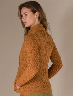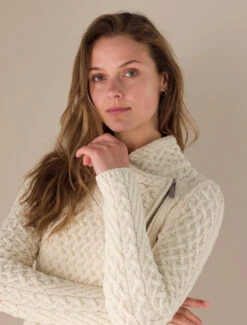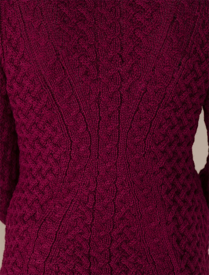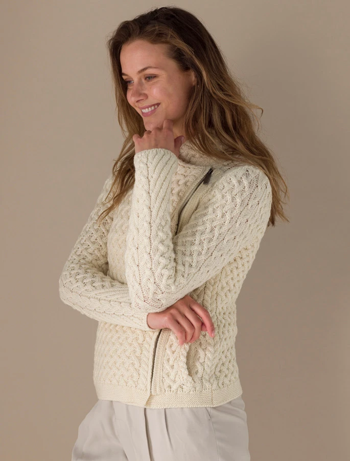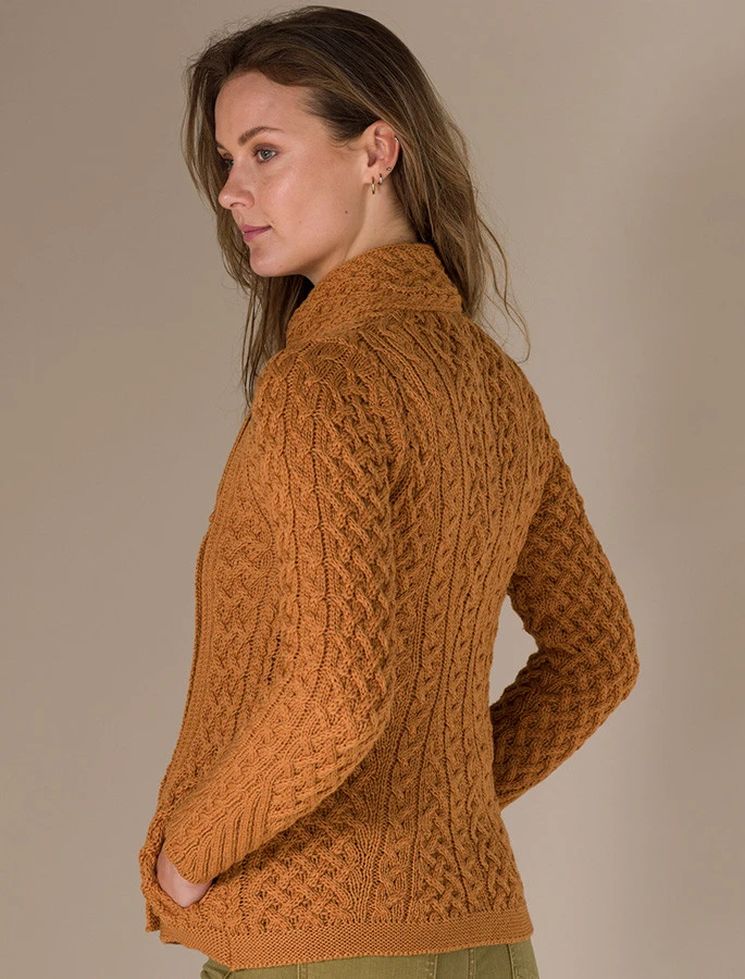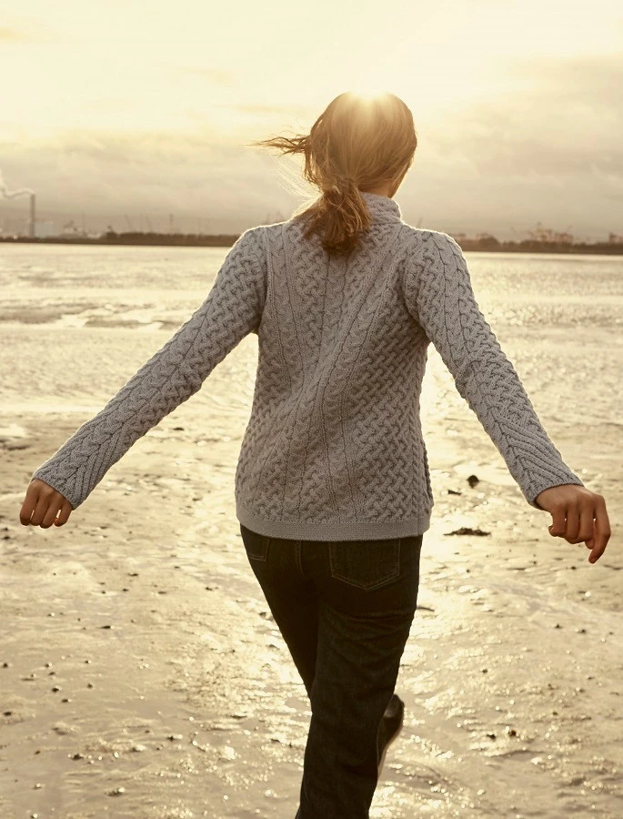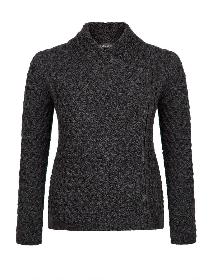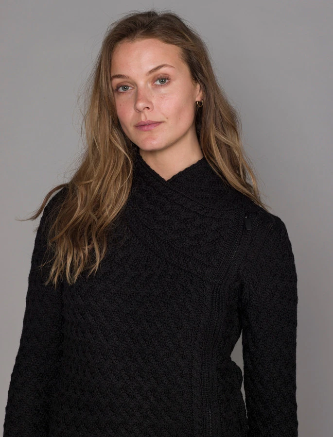 This Cable Knit Jacket features an intricate Cable pattern in a downwards direction resulting in a flattering and slimming effect. Key features include a delicate Celtic Knot design on an original side zip and a shawl collar.
