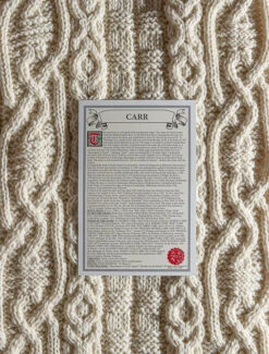 The Carr Clan Aran Scarf is a wonderful item of Carr heritage which will be cherished by the wearer for generations to come. Lovingly crafted from the finest 100% soft new wool, this Aran wool scarf has been created following the unique Carr Clan Aran pattern.ย
