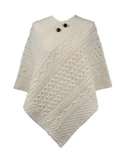 The Cassidy Clan Aran Poncho incorporates honeycomb rope, braid, cables and moss filled diamond stitches. The diamonds symbolise a wish for wealth, the honeycomb represents work and the cables a wish for good luck. This beautiful Aran Poncho has been knitted in the traditional báinín (pronounced ‘baw neen’) colour, the natural white of the wool. It comes to you complete with a clan history and crest. It is made of 100% pure new wool, is water repellent and breathable.