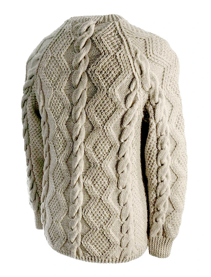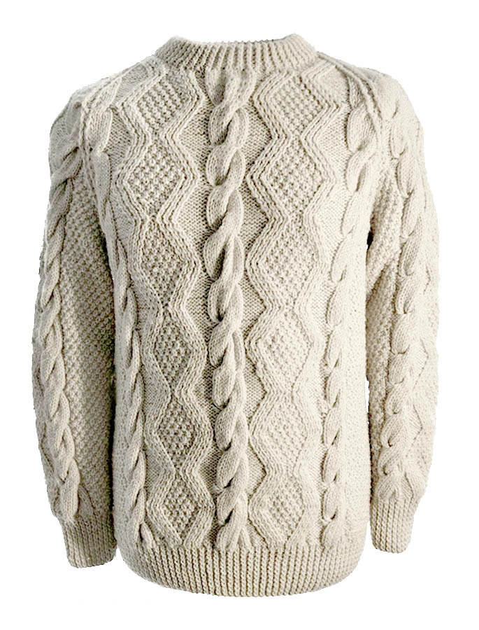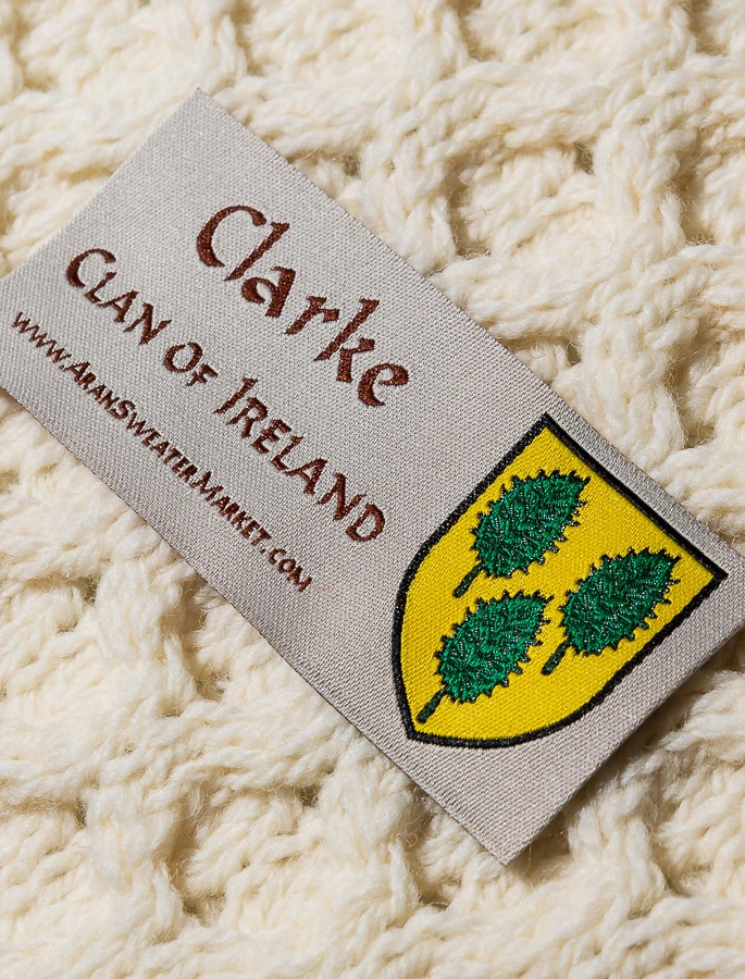 The hand knit Clarke sweater has a rope centre stitch, with moss-filled double zig-zags on either side. The rope is a form of cable stitch, representing good luck, and the zig-zags symbolise the ups and downs of marriage. This beautiful Aran sweater has been hand knitted in the traditional bĂĄinĂn (pronounced âbaw neenâ) colour, the natural white of the wool. It comes to you complete with a clan history and crest. It is made of 100% pure new wool, is water repellent and breathable. It has been hand crafted in the traditional Irish style, and, with care, will last a lifetime.