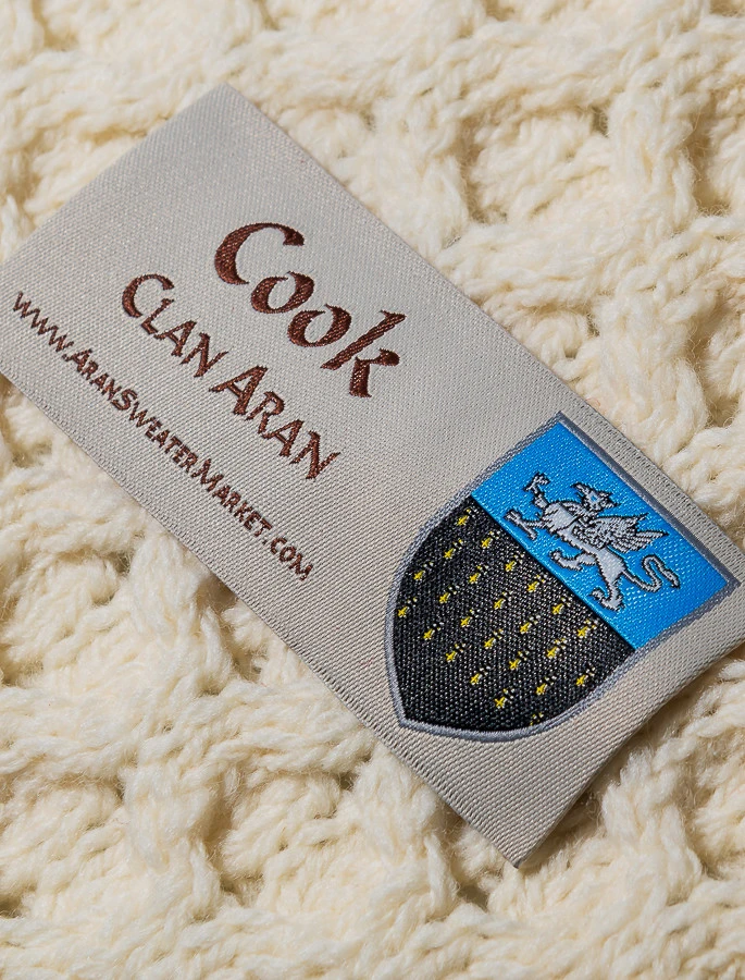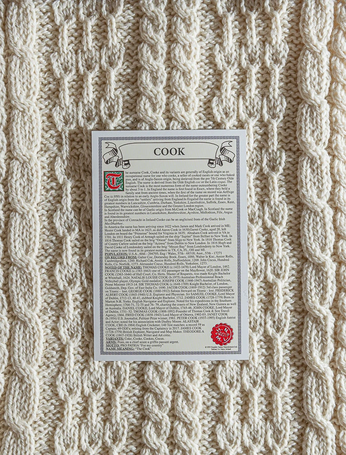 The Cook Clan Aran Throw is a precious gift for any home wherein Cook heritage proudly resides & will be cherished by families of the Cook name for generations to come. Lovingly crafted from the finest 100% soft new wool, this Aran throw (measuring 64″ X 40″) has been created following the unique Cook Clan Aran pattern.