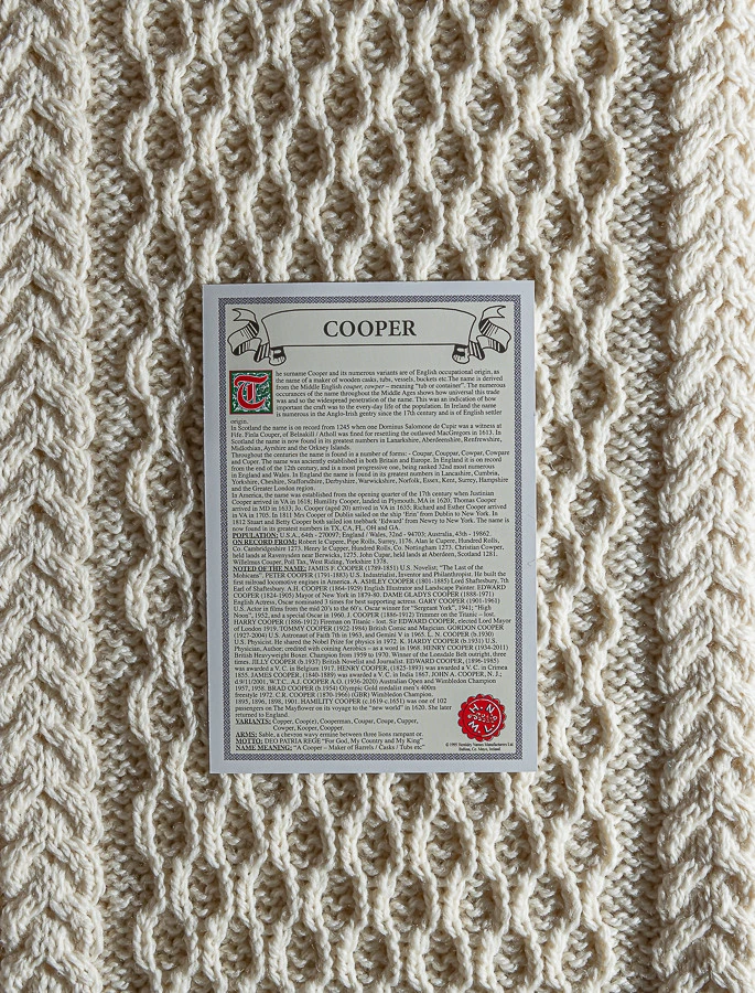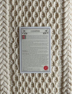The Cooper Clan Aran Throw is a precious gift for any home wherein Cooper heritage proudly resides & will be cherished by families of the Cooper name for generations to come. Lovingly crafted from the finest 100% soft new wool, this Aran throw (measuring 64″ X 40″) has been created following the unique Cooper Clan Aran pattern.