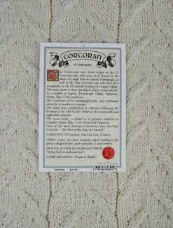 The Corcoran Clan Aran Throw is a precious gift for any home wherein Corcoran heritage proudly resides & will be cherished by families of the Corcoran name for generations to come. Lovingly crafted from the finest 100% soft new wool, this Aran throw (measuring 64″ X 40″) has been created following the unique Corcoran Clan Aran pattern.
