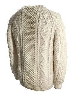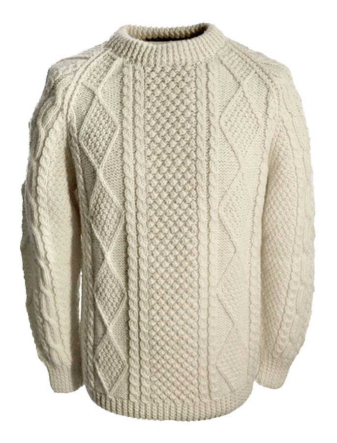 The hand knit Coughlan sweater has a blackberry centre stitch panel, it is flanked by two rows of cables, and moss filled diamonds on either side. The blackberry stitch represents the Holy Trinity. The cable represents good luck and the diamonds symbolise a wish for wealth. This beautiful hand knitted Aran sweater has been hand knitted in the traditional bĂĄinin (pronounced âbaw neenâ) colour, the natural white of the wool. It comes to you complete with a Clan history and crest. It is made of 100% pure new wool, is water repellent and breathable. It has been hand crafted in the traditional Irish style, and with care, will last a lifetime.