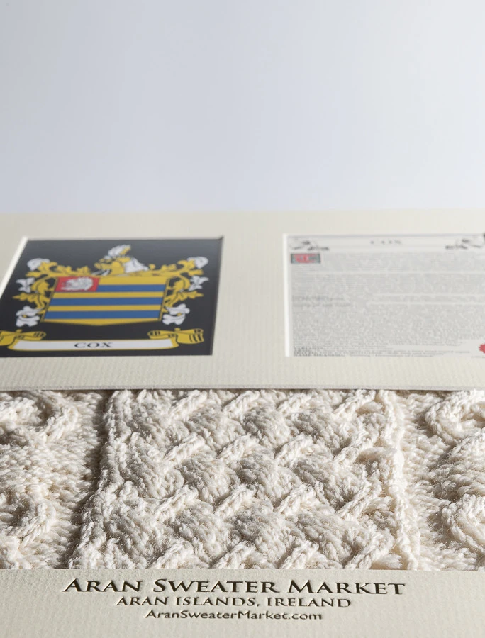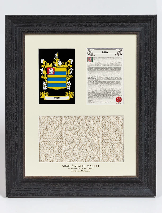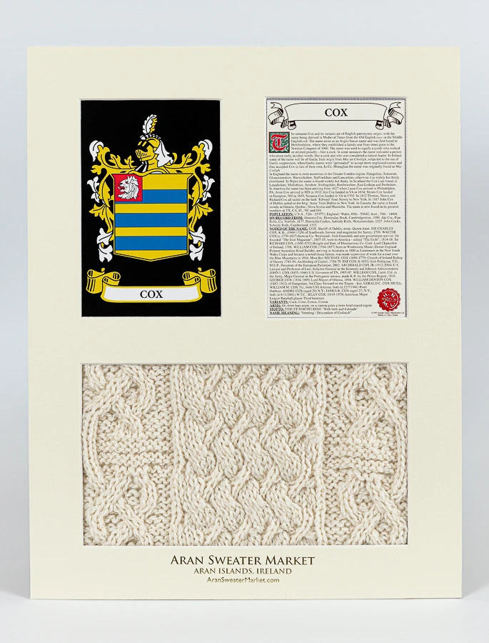 The Cox Clan Aran & History Display is a wonderful item of Cox heritage which can be proudly displayed in your home or place of work to demonstrate the pride your have in your Cox name.