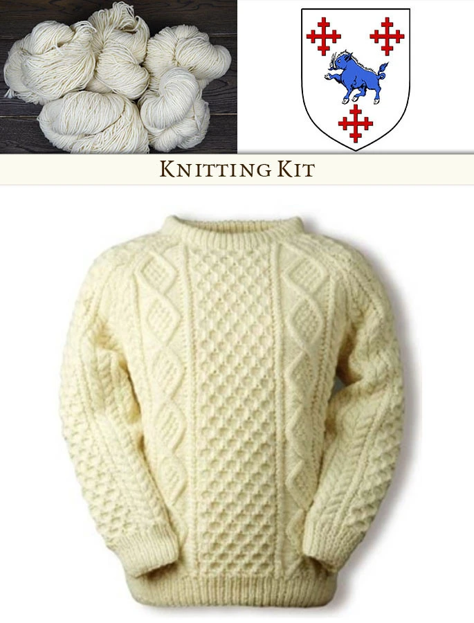 This knitting kit is comprised of the finest traditional pure new Aran Wool, together with your Family Crest, sweater history and your Crowley knitting pattern. We provide enough Aran wool to create your perfectly sized sweater plus a little extra. This Traditional Irish 100% wool is water repellent, breathable and a delight to work with. The pattern is an easy to follow design, tailored specifically to suit your exact size requirements.
