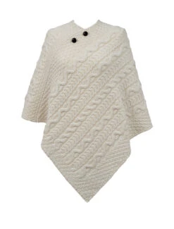 The Cullen Clan Aran Poncho comprises cable, braid and moss stitches. The cable stitches symbolise luck, representing the ropes the fishermen used when fishing. The moss stitch represents nature. This beautiful Aran Poncho has been knitted in the traditional bĂĄinĂn (pronounced âbaw neenâ) colour, the natural white of the wool. It comes to you complete with a clan history and crest. It is made of 100% pure new wool, is water repellent and breathable.Â