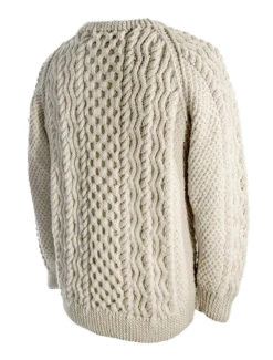 The hand knit Curran sweater has a honeycomb central panel, flanked by alternating rope and double zig-zags on either side. The honeycomb stitch represents work, rope is a form of cable stitch, which symbolises good luck, and the zig-zags represent the ups and downs of marriage. This beautiful Aran sweater has been hand knitted in the traditional báinín (pronounced ‘baw neen’) colour, the natural white of the wool. It comes to you complete with a clan history and crest. It is made of 100% pure new wool, is water repellent and breathable. It has been hand crafted in the traditional Irish style, and, with care, will last a lifetime.