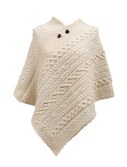 The Daly Clan Aran Poncho has an unusual cable plait centre stitch, flanked by braid, moss, and diamond & cable braids on either side. The cable stitch represents good luck, moss symbolises nature and the diamonds represent wealth. This beautiful Aran poncho has been hand knitted in the traditional báinín (pronounced ‘baw neen’) colour, the natural white of the wool. It comes to you complete with a clan history and crest. It is made of 100% pure new wool, is water repellent and breathable.