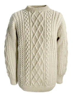 The hand knit Delaney sweater has a blackberry central panel, flanked by cables, small diamonds and larger, moss-filled diamonds on either side. The blackberry stitch is symbolic of the Holy Trinity, cables represent good luck, and diamonds symbolise wealth. This beautiful Aran sweater has been hand knitted in the traditional bĂĄinĂn (pronounced âbaw neenâ) colour, the natural white of the wool. It comes to you complete with a clan history and crest. It is made of 100% pure new wool, is water repellent and breathable. It has been hand crafted in the traditional Irish style, and, with care, will last a lifetime.