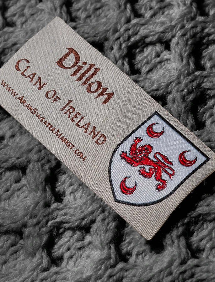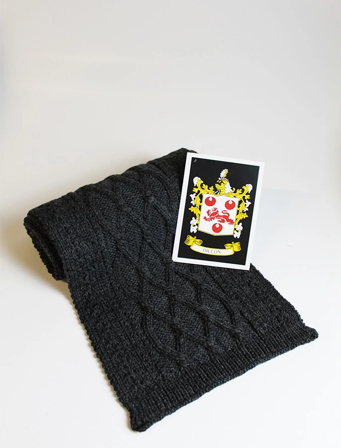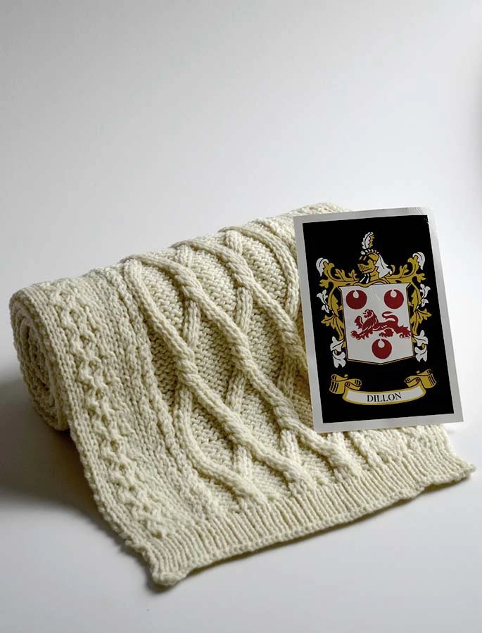 The Dillon Clan Aran Scarf is a wonderful item of Dillon heritage which will be cherished by the wearer for generations to come. Lovingly crafted from the finest 100% soft new wool, this Aran wool scarf has been created following the unique Dillon Clan Aran pattern