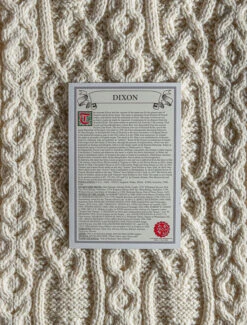 The Dixon Clan Aran Throw is a precious gift for any home wherein Dixon heritage proudly resides & will be cherished by families of the Dixon name for generations to come. Lovingly crafted from the finest 100% soft new wool, this Aran throw (measuring 64″ X 40″) has been created following the unique Dixon Clan Aran pattern.