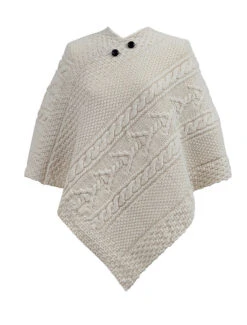 The Doherty Clan Aran Poncho has a chevron centre stitch, flanked by cable, rope and moss on either side. The cable stitch represents good luck, and moss stitch represents nature. This beautiful Aran Poncho has been knitted in the traditional báinín (pronounced ‘baw neen’) colour, the natural white of the wool. It comes to you complete with a clan history and crest. It is made of 100% pure new wool, is water repellent and breathable.
