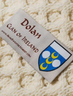 The name Dolan is first found in Leinster where they are believed to be descended from Eochaidh, King of Leinster, and became one of the “Seven septs of Leix. Nowadays the name is generally found in counties Leitrim, Fermanagh and Cavan as well as in counties Galway and Roscommon. ). O Dubhláin is the generally accepted form in Irish today. The name is sometimes anglicised as Dowling or Doolan. The hand knit Dolan sweater has a central cable flanked by twists and honeycomb. The cable stitch represents a wish for good luck, and the honeycomb stitch symbolises work.