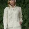 The Donnelly Clan Aran Poncho has a lobster claw centre stitch, flanked by cables, zig-zags, rope and blackberry panels on either side. The lobster claw symbolises a wish for prosperity, cables are good luck, and blackberry is symbolic of the Holy Trinity. This beautiful Aran poncho has been knit in the traditional báinín (pronounced ‘baw neen’) colour, the natural white of the wool. It comes to you complete with a clan history and crest. It is made of 100% pure new wool, is water repellent and breathable.
