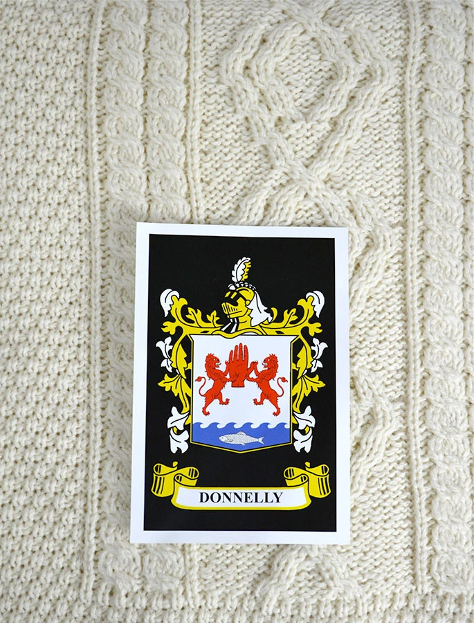 The Donnelly Clan Aran Throw is a precious gift for any home wherein Donnelly heritage proudly resides & will be cherished by families of the Donnelly name for generations to come. Lovingly crafted from the finest 100% soft new wool, this Aran throw (measuring 64″ X 40″) has been created following the unique Donnelly Clan Aran pattern.