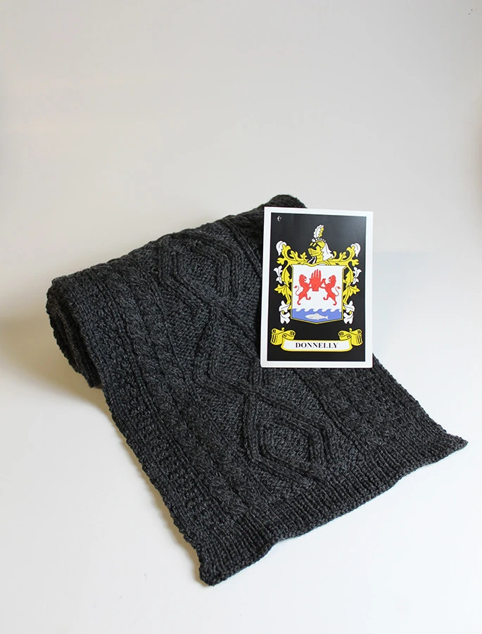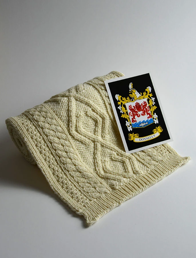 The Donnelly Clan Aran Scarf is a wonderful item of Donnelly heritage which will be cherished by the wearer for generations to come. Lovingly crafted from the finest 100% soft new wool, this Aran wool scarf has been created following the unique Donnelly Clan Aran pattern.
