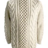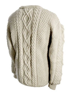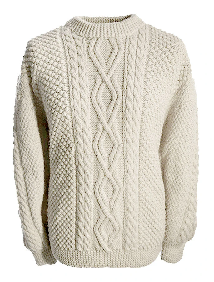 The hand knit Donnelly sweater has a lobster claw centre stitch, flanked by cables, zig-zags, rope and blackberry panels on either side. The lobster claw symbolises a wish for prosperity, cables are good luck, and blackberry is symbolic of the Holy Trinity. This beautiful Aran sweater has been hand knitted in the traditional bĂĄinĂn (pronounced âbaw neenâ) colour, the natural white of the wool. It comes to you complete with a clan history and crest. It is made of 100% pure new wool, is water repellent and breathable. It has been hand crafted in the traditional Irish style, and, with care, will last a lifetime.