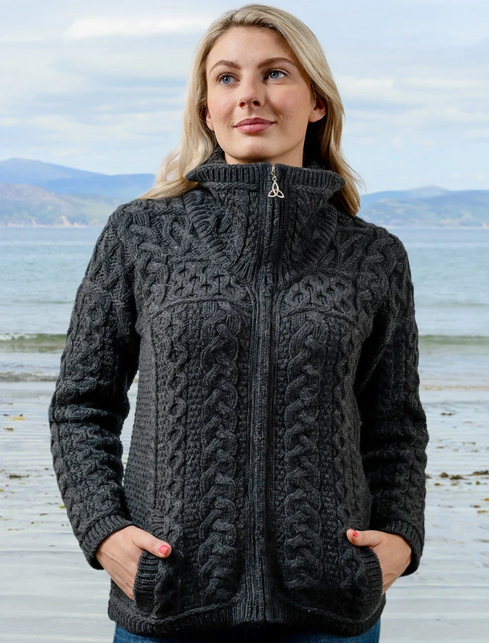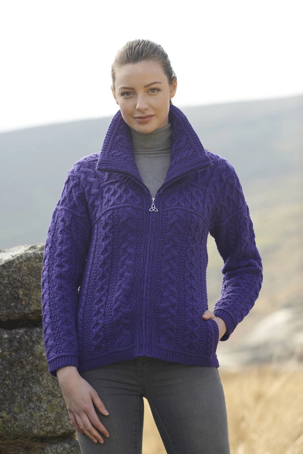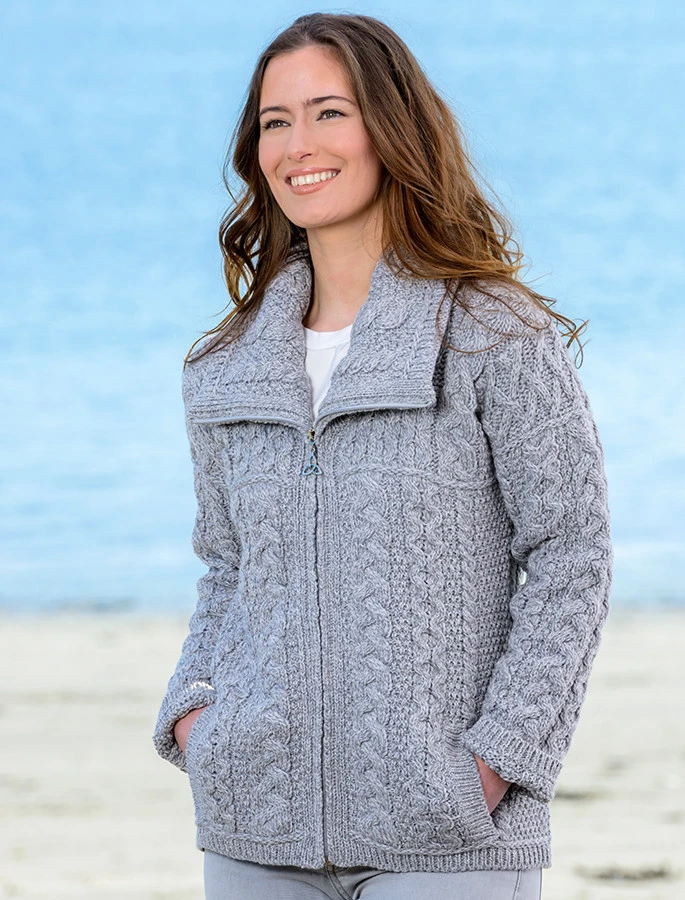 This Double Collar Zip Merino Aran Cardigan is the ultimate cozy cardigan for this Winter season. Thicker and warmer that the standard style of Aran Cardigan, this stylish garment features the Aran Cable design and Celtic Knot zipper pull.