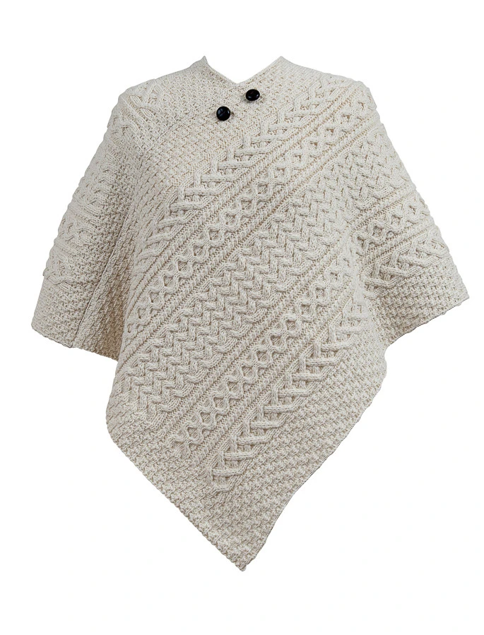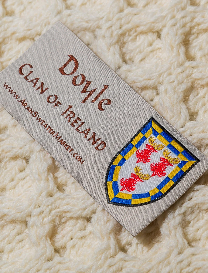 The Doyle Clan Aran Poncho has a basket centre stitch, flanked by cable, honeycomb rope, plait, and blackberry stitches on either side. The basket stitch is symbolic of a wish for a full catch for the fisherman, cable represents good luck, honeycomb symbolises work and blackberry is symbolic of the Holy Trinity. This beautiful Aran Poncho has been knitted in the traditional báinín (pronounced ‘baw neen’) colour, the natural white of the wool. It comes to you complete with a clan history and crest. It is made of 100% pure new wool, is water repellent and breathable.
