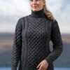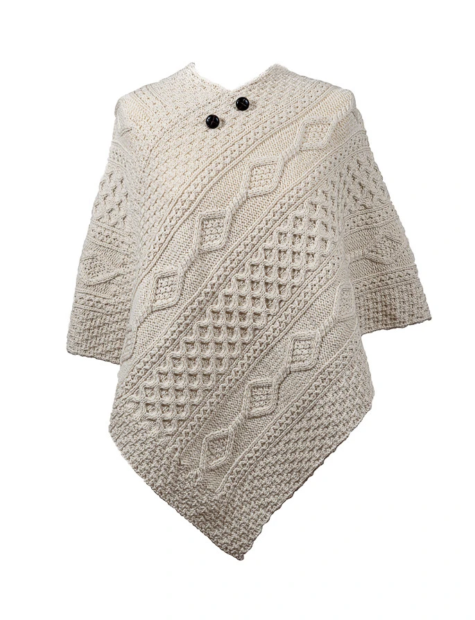 The Duffy Clan Aran Poncho has a cable centre panel, flanked by honeycomb, lobster claw and blackberry stitches on either side. The cable is symbolic of good luck, honeycomb represents work, lobster claw is a wish for prosperity and blackberry is symbolic of the Holy Trinity. This beautiful Aran Poncho has been knitted in the traditional báinín (pronounced ‘baw neen’) colour, the natural white of the wool. It comes to you complete with a clan history and crest. It is made of 100% pure new wool, is water repellent and breathable.