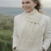 The Dunne Clan Aran Poncho has a cable centre panel, flanked by honeycomb, lobster claw and blackberry stitches on either side. The cable is symbolic of good luck, honeycomb represents work, lobster claw is a wish for prosperity and blackberry is symbolic of the Holy Trinity. This beautiful Aran Poncho has been knitted in the traditional báinín (pronounced ‘baw neen’) colour, the natural white of the wool. It comes to you complete with a clan history and crest. It is made of 100% pure new wool, is water repellent and breathable.