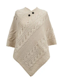 The Egan Clan Aran Poncho incorporates the blackberry, cable and tree of life stitches. The blackberry stitch represents the Holy Trinity, the cable stitch symbolises luck and the Tree of Life symbolises Family. This beautiful Aran poncho has been knit in the traditional báinín (pronounced ‘baw neen’) colour, the natural white of the wool. It comes to you complete with a clan history and crest. It is made of 100% pure new wool, is water repellent and breathable.