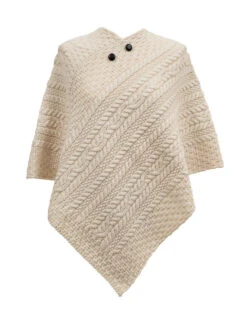 The Foley Clan Aran Poncho has a small honeycomb central panel, flanked by cables, diamond stitches with a central cable, and tree of life on either side. The honeycomb stitch represents work, cables are symbolic of good luck, and the tree of life symbolises family unity. This beautiful Aran poncho has been knit in the traditional báinín (pronounced ‘baw neen’) colour, the natural white of the wool. It comes to you complete with a clan history and crest. It is made of 100% pure new wool, is water repellent and breathable.
