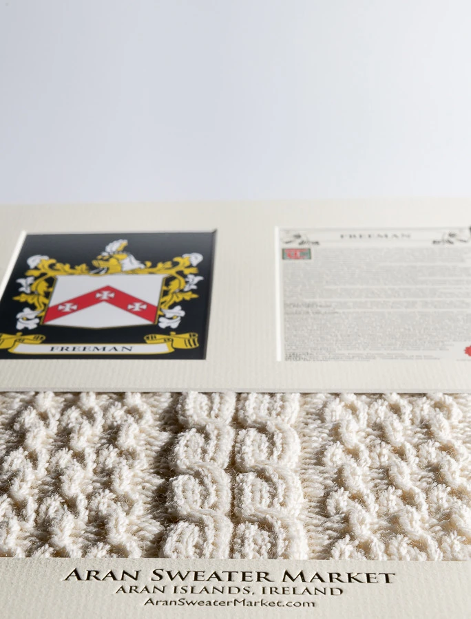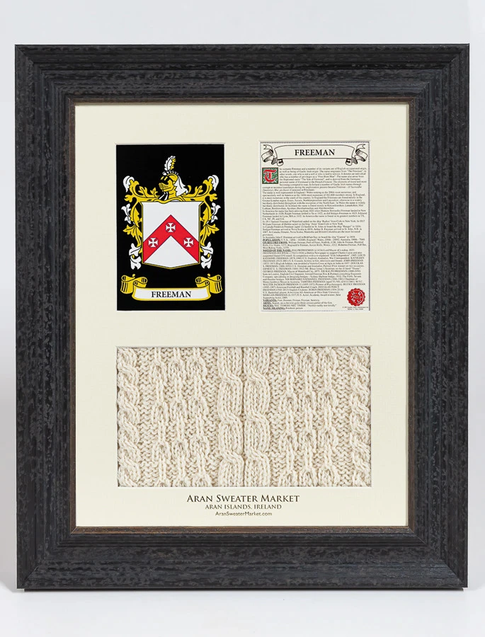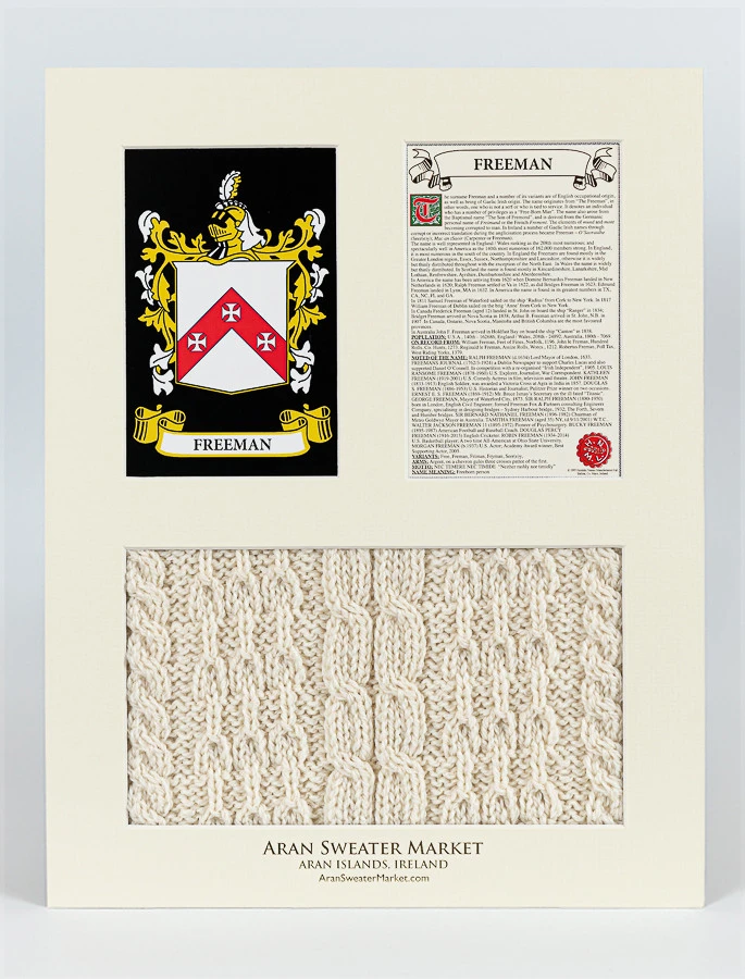 The Freeman Clan Aran & History Display is a wonderful item of Freeman heritage which can be proudly displayed in your home or place of work to demonstrate the pride your have in your Freeman name.
