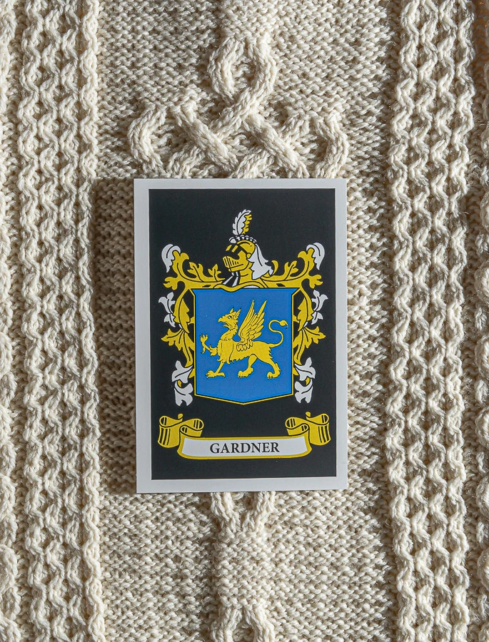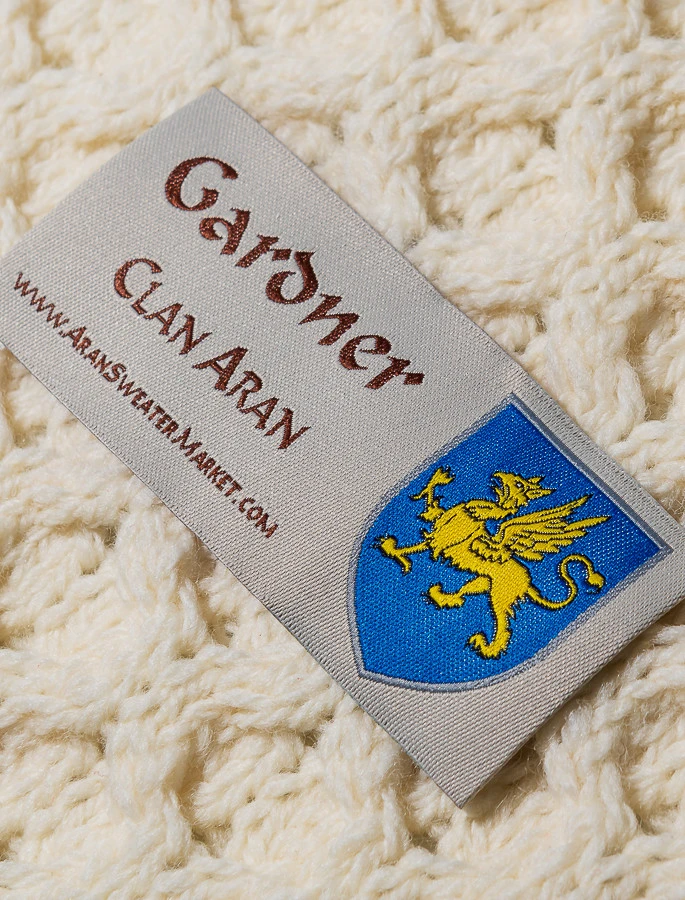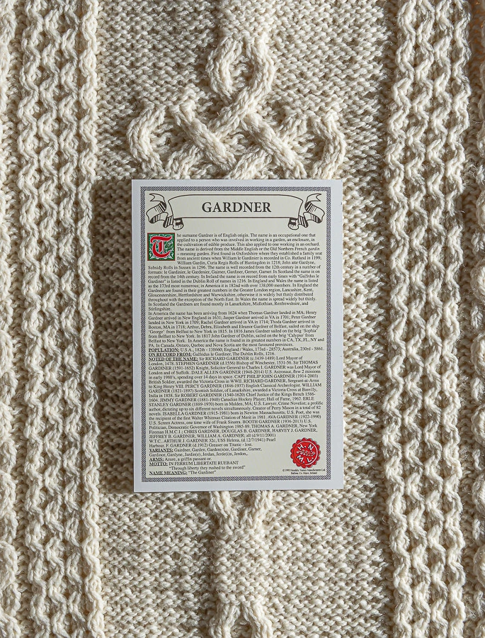 The Gardner Clan Aran Throw is a precious gift for any home wherein Gardner heritage proudly resides & will be cherished by families of the Gardner name for generations to come. Lovingly crafted from the finest 100% soft new wool, this Aran throw (measuring 64″ X 40″) has been created following the unique Gardner Clan Aran pattern.