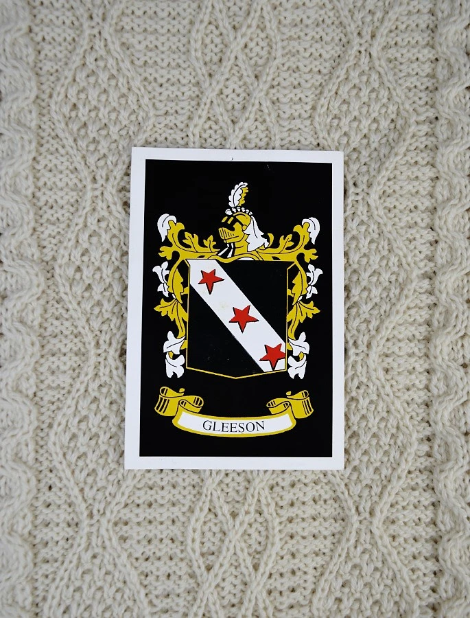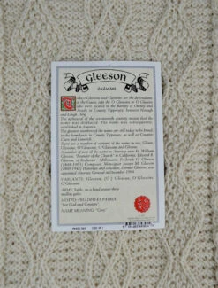 The Gleeson Clan Aran Scarf is a wonderful item of Gleeson heritage which will be cherished by the wearer for generations to come. Lovingly crafted from the finest 100% soft new wool, this Aran wool scarf has been created following the unique Gleeson Clan Aran pattern.