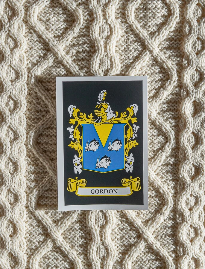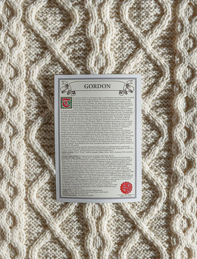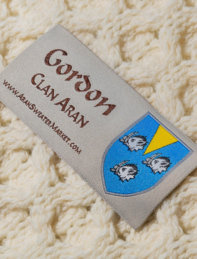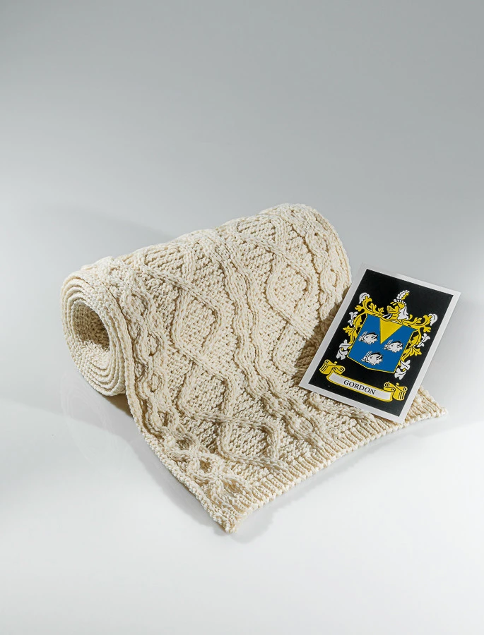 The Gordon Clan Aran Scarf is a wonderful item of Gordon heritage which will be cherished by the wearer for generations to come. Lovingly crafted from the finest 100% soft new wool, this Aran wool scarf has been created following the unique Gordon Clan Aran pattern.