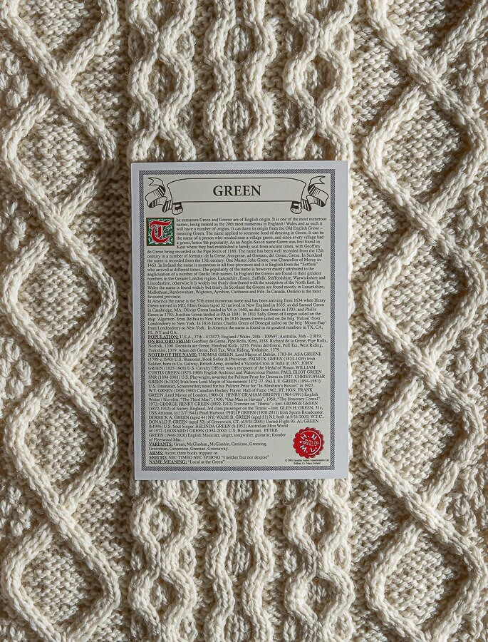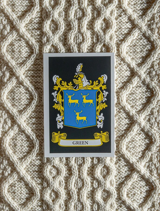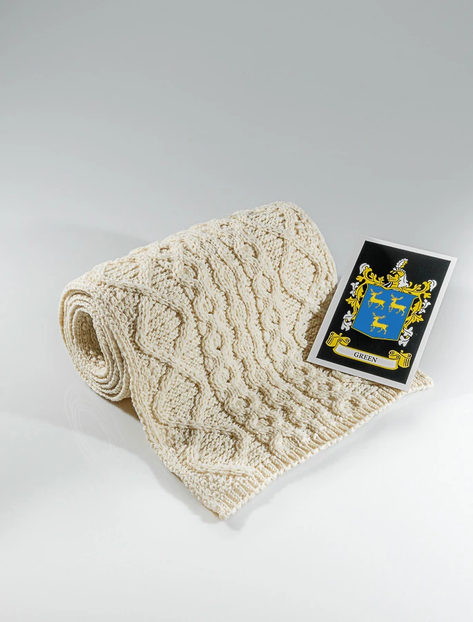 The Green Clan Aran Scarf is a wonderful item of Green heritage which will be cherished by the wearer for generations to come. Lovingly crafted from the finest 100% soft new wool, this Aran wool scarf has been created following the unique Green Clan Aran pattern.ย