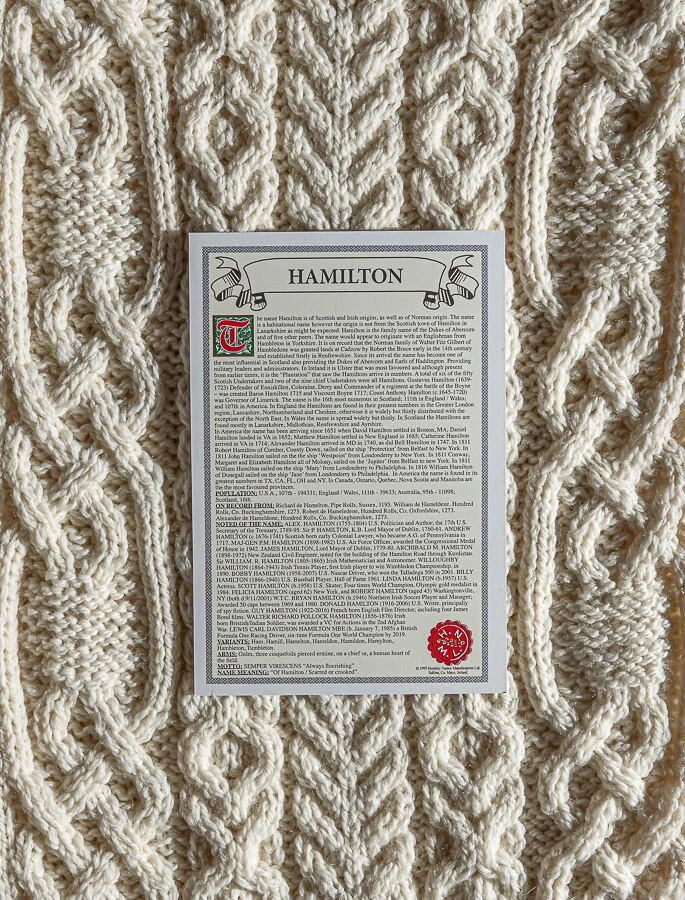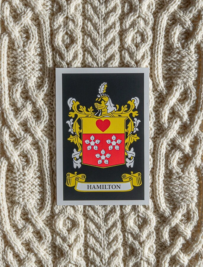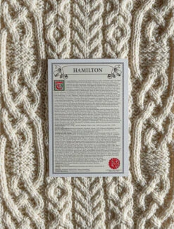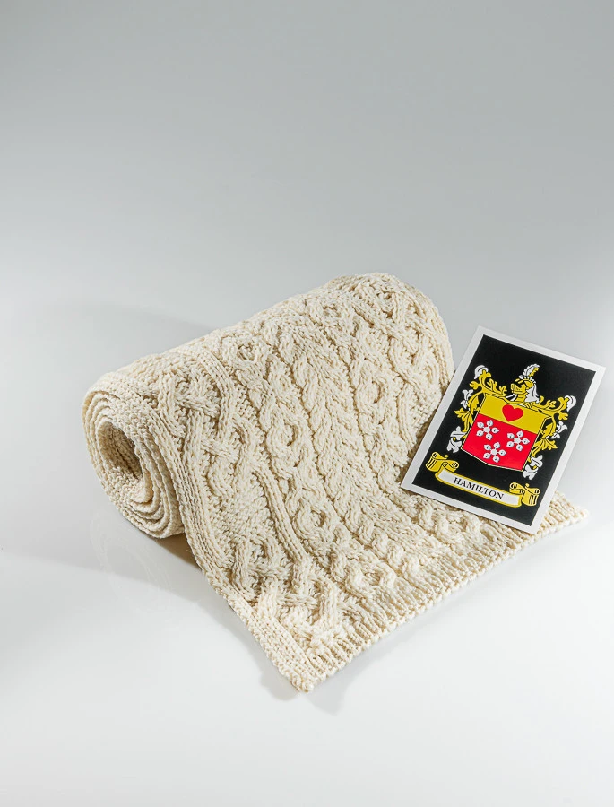 The Hamilton Clan Aran Scarf is a wonderful item of Hamilton heritage which will be cherished by the wearer for generations to come. Lovingly crafted from the finest 100% soft new wool, this Aran wool scarf has been created following the unique Hamilton Clan Aran pattern.ย
