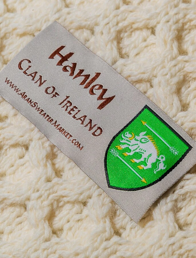 The hand knit Hanly sweater has a central panel of ropes flanked by cable and moss filled diamonds. The cable and rope stitch represent a wish for good luck. The diamond stitch symbolises a wish for wealth. This beautiful hand knitted Aran sweater has been hand knitted in the traditional báinin (pronounced ‘baw neen’) colour, the natural white of the wool. It comes to you complete with a Clan history and crest. It is made of 100% pure new wool, is water repellent and breathable. It has been hand crafted in the traditional Irish style, and with care, will last a lifetime.