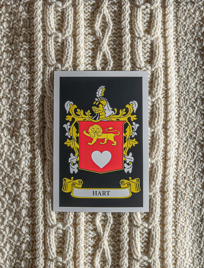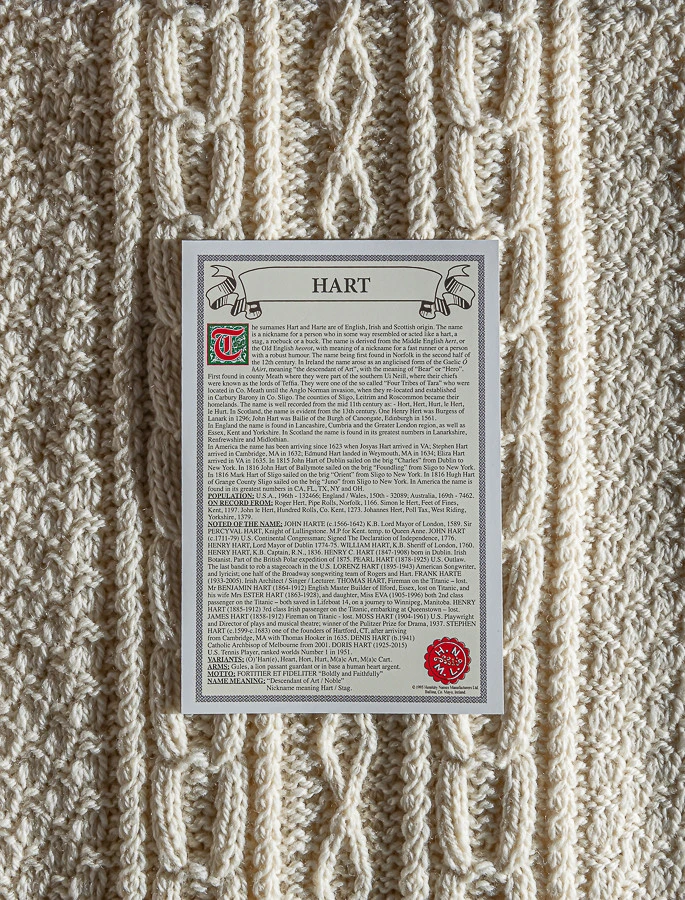 The Hart Clan Aran Throw is a precious gift for any home wherein Hart heritage proudly resides & will be cherished by families of the Hart name for generations to come. Lovingly crafted from the finest 100% soft new wool, this Aran throw (measuring 64″ X 40″) has been created following the unique Hart Clan Aran pattern.