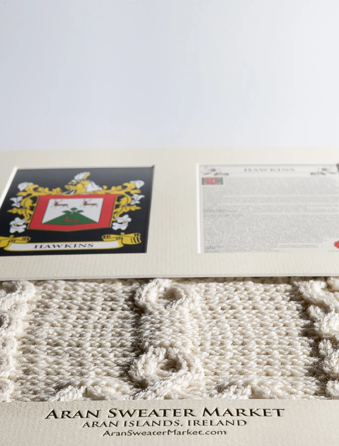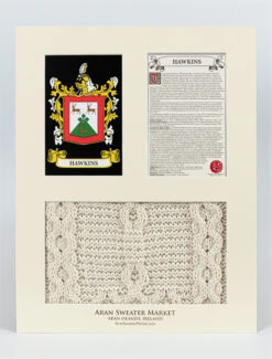 The Hawkins Clan Aran & History Display is a wonderful item of Hawkins heritage which can be proudly displayed in your home or place of work to demonstrate the pride your have in your Hawkins name.