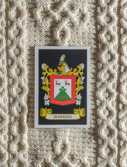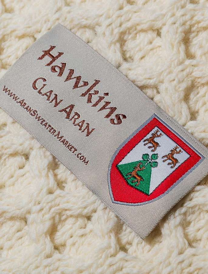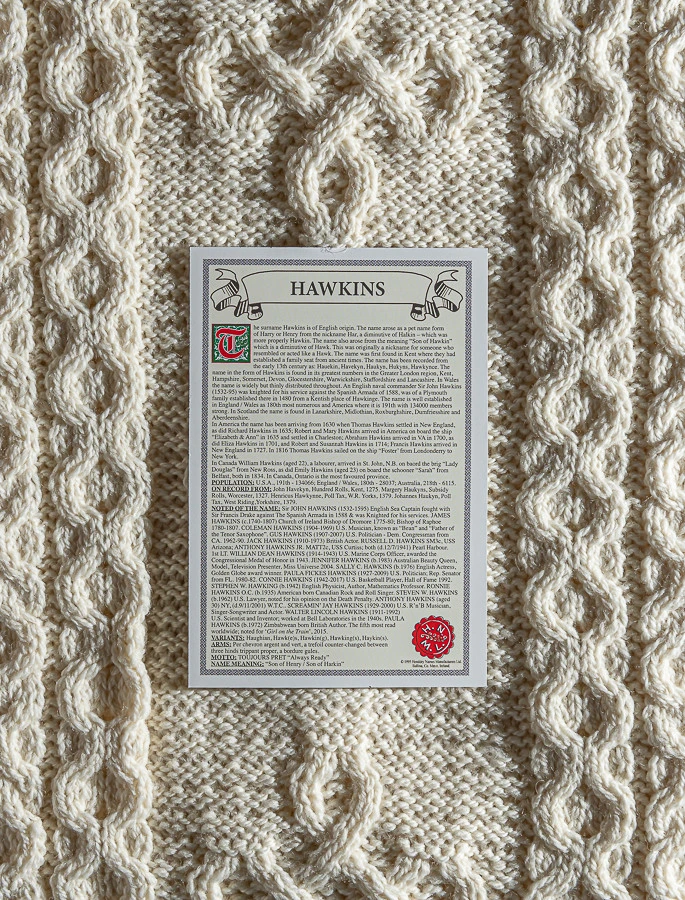 The Hawkins Clan Aran Throw is a precious gift for any home wherein Hawkins heritage proudly resides & will be cherished by families of the Hawkins name for generations to come. Lovingly crafted from the finest 100% soft new wool, this Aran throw (measuring 64″ X 40″) has been created following the unique Hawkins Clan Aran pattern.