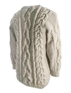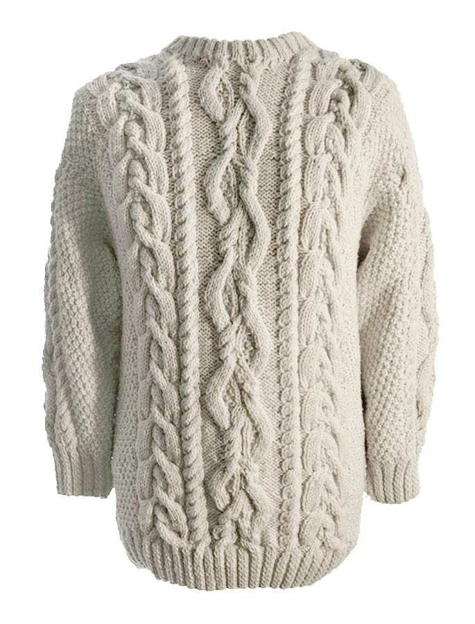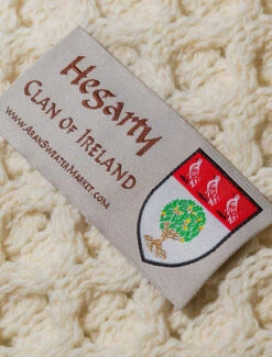 The hand knit Hegarty sweater incorporates cable rope and moss stitches. The moss stitch represents nature. The rope stitch is a form of cable which represents good luck. This beautiful hand knitted Aran sweater has been hand knitted in the traditional báinin (pronounced ‘baw neen’) colour, the natural white of the wool. It comes to you complete with a Clan history and crest. It is made of 100% pure new wool, is water repellent and breathable. It has been hand crafted in the traditional Irish style, and with care, will last a lifetime.