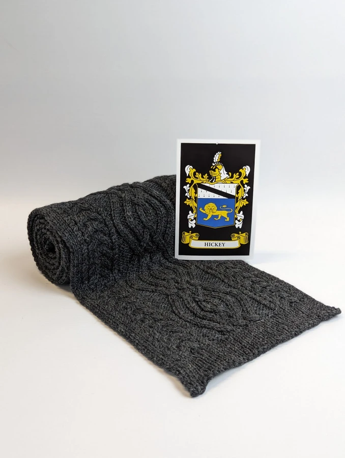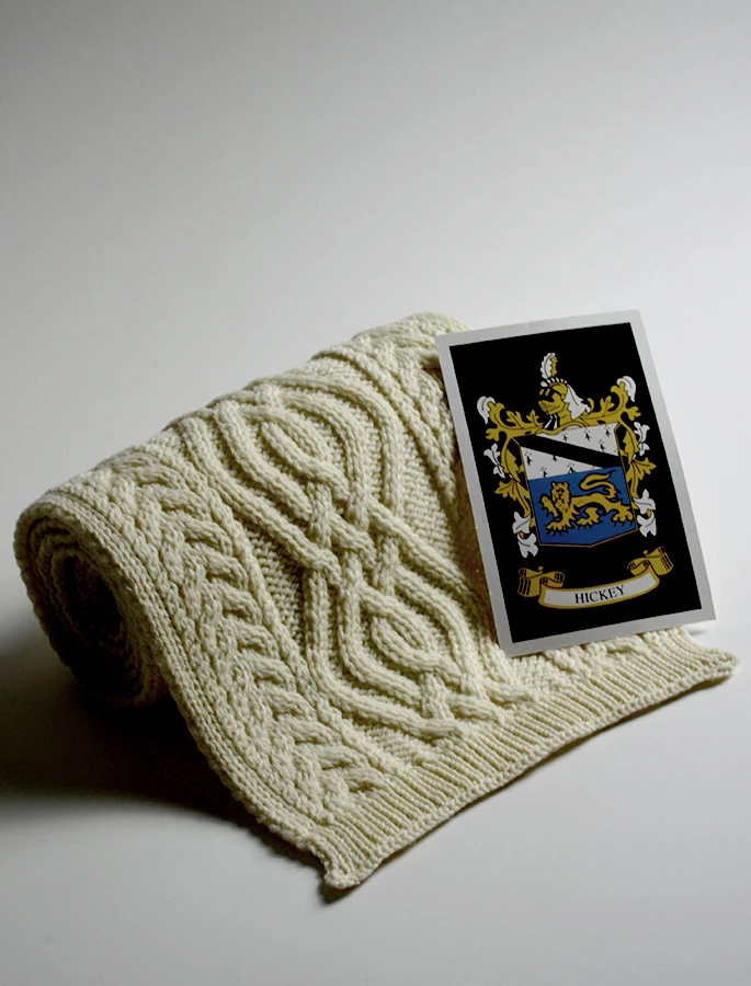 The Hickey Clan Aran Scarf is a wonderful item of Hickey heritage which will be cherished by the wearer for generations to come. Lovingly crafted from the finest 100% soft new wool, this Aran wool scarf has been created following the unique Hickey Clan Aran pattern.